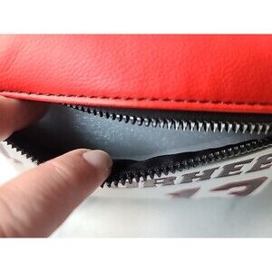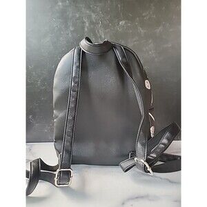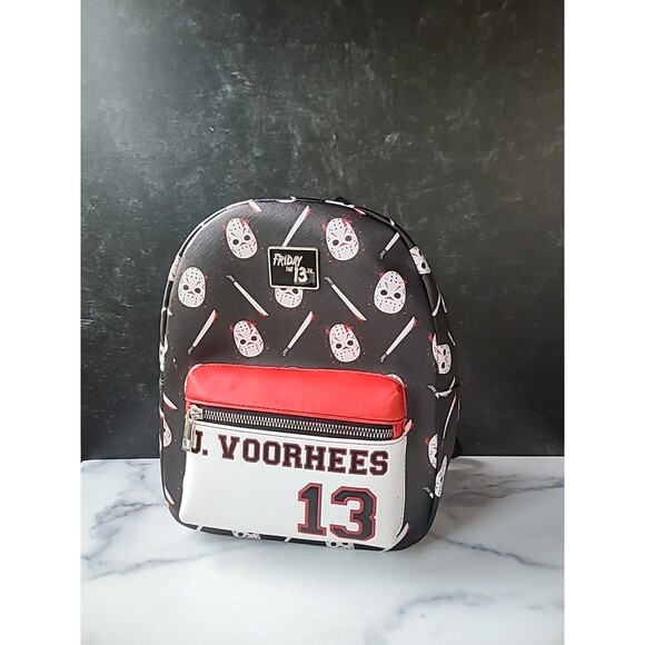 This is a novelty women's mini Friday the 13th backpack in black, red, and white.