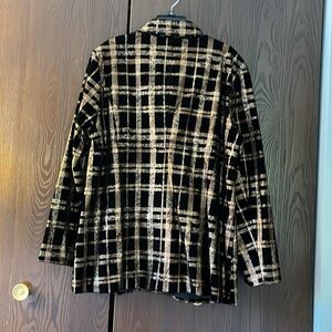 Birch Hill black velvet jacket with gold metallic plaid pattern. Size XL. The length measures 30.5 inches. Pit to pit measures 25 inches.
