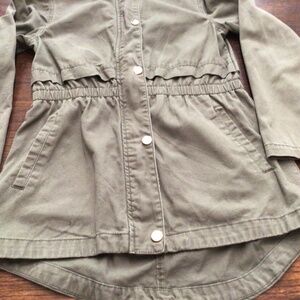 Birch & Stone Army green jacket with hood. Size 10. This jacket is really cute. The jacket has two front pockets has gold tone snap buttons over a gold tone zipper the jacket has an elastic waist. The back of the jacket is just a little bit longer than the front. The measurements are as follows with jacket zipped up pit to pit is approximately 16 1/2 inches. The length is approximately 24 inches in the front 26 inches in the back. The sleeve length from pit to cuff is approximately 16 inches. If you have any questions, please contact me I’m still running the special if you purchase four or more items from my closet and get 25% off the entire. Thank you and have a great day.