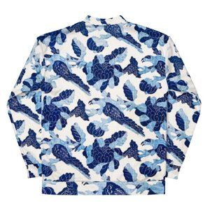 Add a little zing to your wardrobe with this vibrant All-Over Print Bird And Flower Pattern Blue White Motif Bomber Jacket.