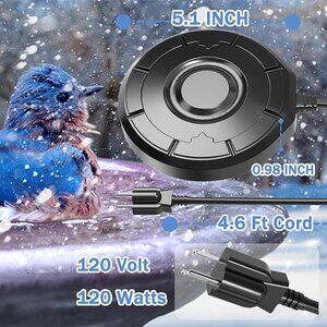 Enhanced 120V 120W Outdoor Bird Bath De-Icer Thermostat Control, lasting heat release, intelligent thermostat control, low temperture icing trgger release of heat, winter bird bath no icing, bring a touch of warmth to your animal friends in winter. Thermostat control runs only when needed, stops running when not needed, safer and more energy saving! Welcome more birds, squirrels, rabbits, etc. to play in your garden!