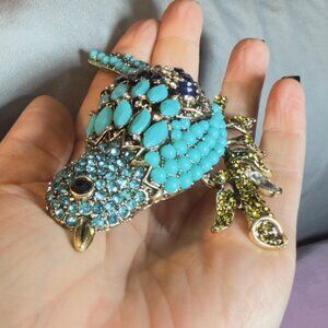 This modern statement bird brooch features a domed body with intricate open metalwork and layered marquise and round stones for depth and texture. The perched design includes a sparkling green rhinestone branch and mixed blue tones ranging from turquoise to deep cobalt. Finished with a secure C clasp closure, in excellent condition with no flaws and no maker’s marks present.