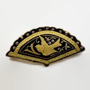 I love damascence jewelry and bird jewelry so this pin is one of my favorites! Stunning gold and black etching covers this fan shaped vintage brooch. A beautiful flying bird is in the center. Flowers, leaves and dots are more details. This older piece closed with a trumpet clasp. Great piece for your collection!