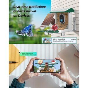 Brand new still in original packaging bird feeder with camera with incredible features to enhance your bird-watching experience. It boasts a 1080P full HD resolution with 168° wide viewing angle for crystal-clear videos—even at night! The smart camera can identify over 11,000 bird species, offering one month of free AI recognition (subscription needed for continued use). Watch the birds from your smartphone at any time and talk through the built-out two-way audio to interact with your garden visitors. This feeder is power-efficient with dual solar panels and designed to endure all weather conditions, thanks to its IP66 weatherproof rating. Plus, it comes with multiple feeding accessories to attract a variety of birds. Set this up in your backyard and let the bird watching begin!