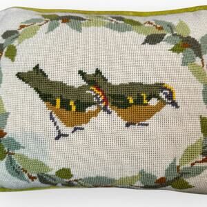 Gorgeous Decorative Needlepoint Accent Pillow Featuring Two Birds Centered Within a Leaf Wreath. Front Needlepoint Panel With A Solid Yellow Velvet Back, Piped Edges, Removable Pillow Insert.