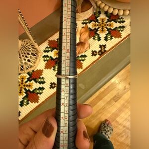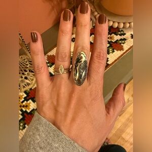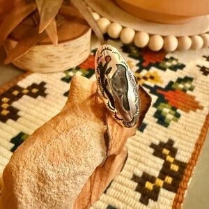 This ring is so unique! Unfortunately, the turquoise inlay came out and would need to be taken to an artisan to be fixed. This ring was made (see stamped picture) but does not say specifically that it is 925 Sterling Silver. Never turned my finger green and shines up with a silver polish cloth so believe it to be SS. Stunning ring! Size 8.