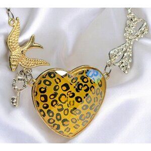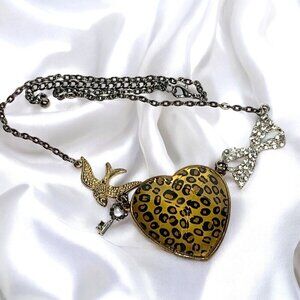 A unique whimsical silver chainlink necklace featuring four pendants, one gold bird in flight, a silver crystal encrusted key, a large faux gem heart with black and gold animal print and a silver crystal encrusted key. Lobster clasp at the back of the neck. Necklace is 18" in length. Excellent preowned condition.