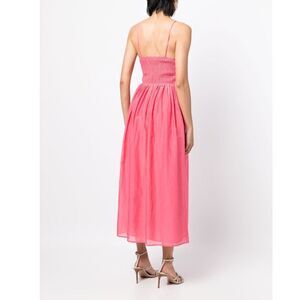 new with tags size extra small retail $600 Channeling Bird & Knoll's wanderlust DNA, this Bayou dress is cut from cotton-silk in a mood-boosting shade of red. The tie front frames your bust and it falls to a billowing hem. Complete your look with drop earrings and your favorite clutch. Adjustable straps. Side slit pockets. Fabric: 70% cotton, 30% silk Pull-over style color: pink C0 tags: designer summer vacation NWT