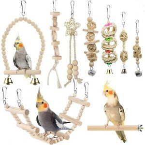 🧿MULTI FUNCTION BIRD TOYS: The bird toys include 9 different parrot toys to meet any pet bird's needs.Natural wooden toys and crisp bells sounds can attract the attention of pet birds, they are suitable for parrot sports,standing,climbing, playing, chewing, resting,etc. It's the perfect gift for your birds.