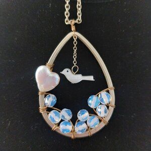 Bird Pendant Necklace Handmade Cats Eye Mother Pearl Dangle Long Ra…