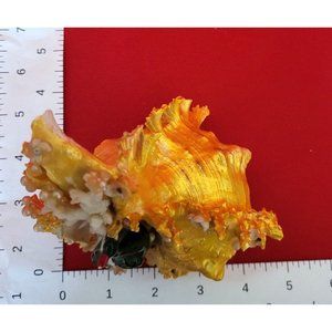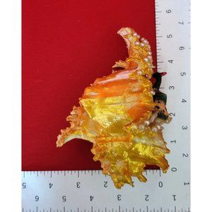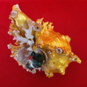 Bird Standing on Sea Shell Table Decor in great condition. With pearls, coral and colored stones on front face of shell.