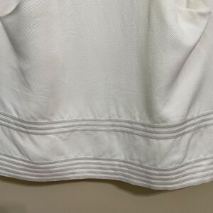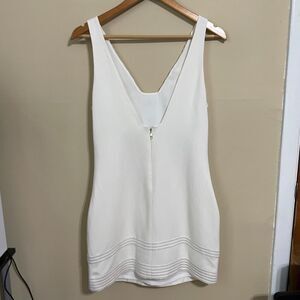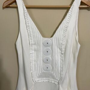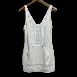 Elegant white mini dress. Features intricate front detailing. Sleeveless design with pockets.