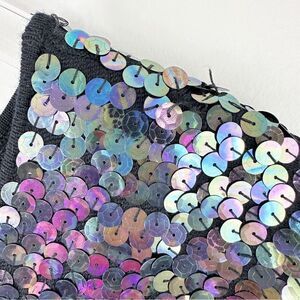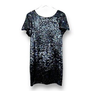 Bird by Juicy Couture sequin flutter sleeve short knit dress. Large sequins in a midnight mermaid color scheme are sewn to a lovely soft wool knit dress with a lovely drape. It has looser, fluttery sleeves and a comfortable stretch. Scoop neck-line. Pull-over style.