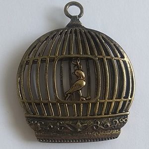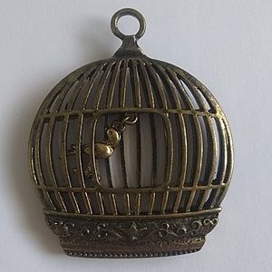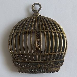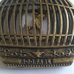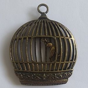 This is a substantial size bird in cage pendant only, with no chain. The bird swings freely, and the word, "ADORABLE" is stamped near the base on the side with no opening. It measures approximately 1-13/16" W x 2-3/16" H x 1/4" D.