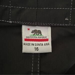 Bird well Beach Britches Black Board shorts Kauai patch size 16 in excellent condition except little bit of over stitching see last pic on leg. Measurements laying flat waist 19 1/2 inches across and inseam 5 1/2 inches and rise 11 inches