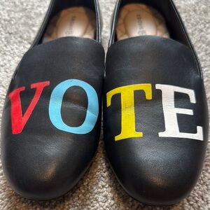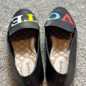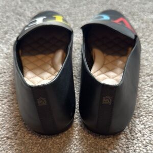 Step out in style with Birdies' black and red flats, featuring a minimalist design and a comfortable quilted interior. These shoes are perfect for everyday wear, offering both practicality and a touch of flair with their bold lettering.