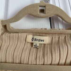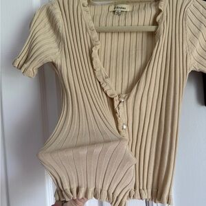 Chic ribbed blouse with button-up front. Features ruffle trim for added elegance. Perfect for versatile styling. Super stretchy!