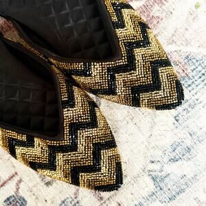 tags: Birdies shoes, Birdies loafers, Birdies The Swan, deco chevron shoes, black gold loafers, beaded flats, beaded loafers, elegant flats, holiday party shoes, dressy loafers, size 8.5 flats, luxury comfort shoes, Birdies mules, quiet luxury flats, black and gold shoes