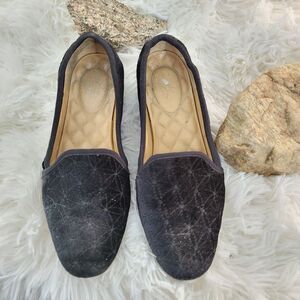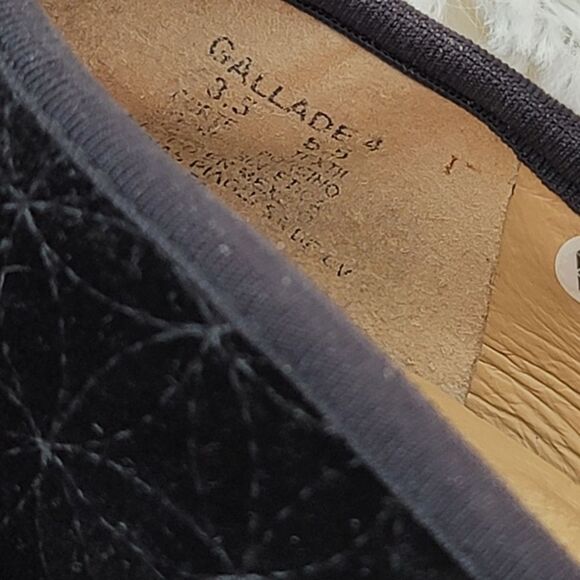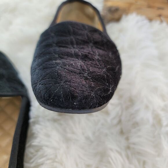 Black quilted velvet slip on loafers. Preloved condition. All sections of interest as well any known flaws have been documented in the photos and noted as thoroughly as possible. if there are no known flaws, none will be noted. Please feel free to ask any questions before purchase 🙂.