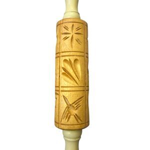 The product is a vintage embossed wood rolling pin featuring an owl design engraved on its surface. This 14" dough roller is perfect for creating beautifully detailed patterns on cookies and other baked goods. Made of brown wood, this collectible kitchen accessory adds a touch of retro charm to any baking project, making it a unique and stylish addition to any rolling pin collection.