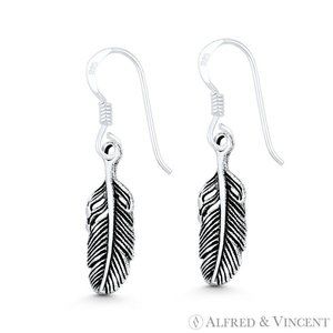 Bird's Wing Feather Dangling Hook Earrings in Oxidized .925 Sterling Silver
