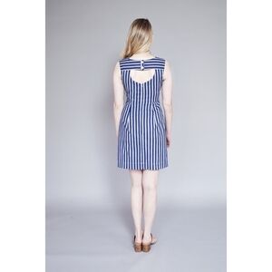 Cute and classic! The Whydah dress has a fitted bodice with a straight-fit skirt. There's a cute peek-a-boo opening at the back with two white buttons to close it. The contrasting stripe directions give this dress a dynamic and flattering silhouette - vertical stripes on the skirt add length to your legs and diagonal stripes at the bodice create a slimming look.