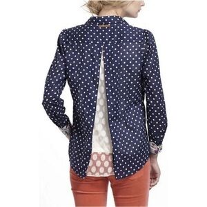 Anthropologie Travota Trovata Birds Of Paradise Shirt Blue Polka Dots & Lace Back Blouse. 100% cotton. Machine wash. Half button. Foldable cuff with floral print. Back lace peek super unique and cute. Excellent used condition. No holes or stains. Non-smoking home. Tags: trendy, stylish, high-quality, unique, statement piece, chic, feminine, on-trend, popular, must-have, comfortable, lightweight, breathable, versatile, fashionable, eye-catching, distinctive, casual wear, polished, refined, effortless, easy-to-wear, premium, delicate detailing, perfect for adding a playful touch to any outfit, sophisticated, whimsical design, elegant, Career, office attire, work, professional, polished, mature, sophisticated, business, corporate, careerwear, businesscore, work clothes, dress code, job interview