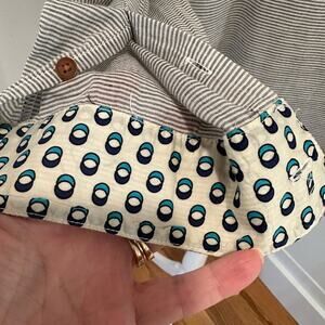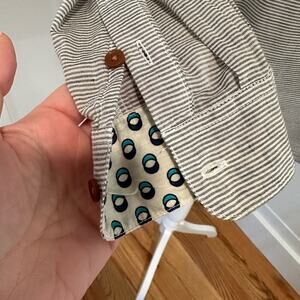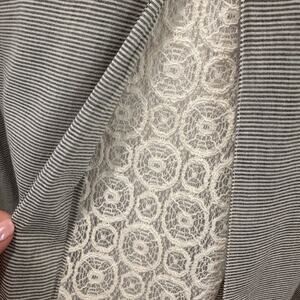 Beautiful gray pinstripe with l contrasting blue and cream fabric on inner collar and cuffs. Lace panel in back. Curved hem. 100% cotton very light weight material.