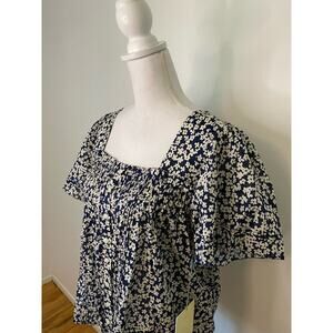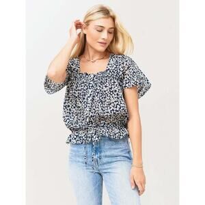 Gorgeous light and airy peasant blouse with blue & white floral pattern, square neckline, and waist tie for a cinched waist look. Color is Blueprint. NWT