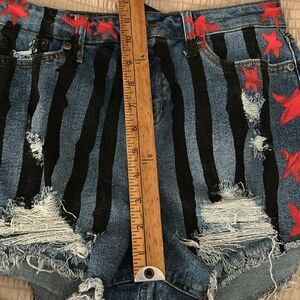 Stylish denim shorts featuring a bold star pattern. Perfect for a casual day out.