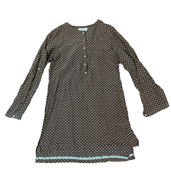 Birds of a Feather by Trovata Silk Dress Size Large. Gorgeous gently used condition with no flaws. Beautiful geometric pattern with blue, mustard, and pink details. Buttons down the front and long sleeves. Hits above the knee. Originally $368 from California brand. 100% silk.
