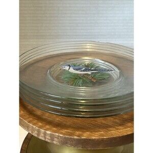 Set of 4 8-inch clear glass dessert plates featuring different birds. This set includes a Bluejay a Goldfinch, Robin and Tufted Tit mouse. These are reverse painted/printed from the back so using them will not disturb the design. There are a couple of very minor scratches on the back of a couple plates that does not disturb the birds, just the clear glass. I have tried to take pictures, they were very hard to see, and harder to photograph.