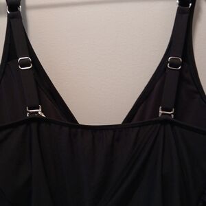 Introducing the Birdsong Slimming Wrap Underwire One-Piece Swimsuit in black, size 16. This high-quality swimsuit features wide straps, a solid pattern, and a flattering wrap design that will make you feel confident at the beach or pool. The swimsuit is made of a comfortable blend of polyester, nylon, and spandex, with accent straps that add a touch of sophistication.