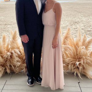 Fitted waist with floor-length, sweeping skirt + hidden side pockets