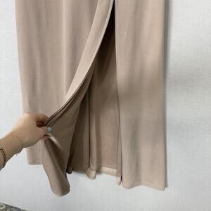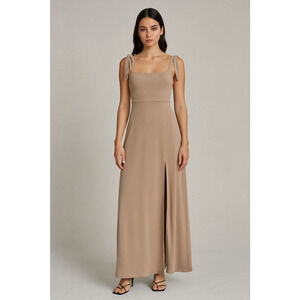 Beautiful full-length taupe/beige maxi dress with square neckline and side leg slit for easy movement and style.
