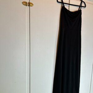 Great look, black dress, cowl neckline, adjustable spaghetti straps, 28" slit up the left front of dress, is 96% polyester and 4% spandex so has some stretch to it. Worn once for a wedding. Very good condition. Party dress, prom dress, evening dress or bridesmaid dress looks great for all.