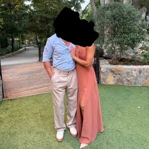 Worn once and hemmed. The bottom originally came so uneven..took about 2" off. I'm 5'5" and my heels were 3.54"