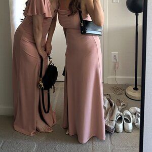 Only worn once! This dusty rose crepe dress has been professionally hemmed to fit someone around 5'1 and when worn with 3.5 inch heels, the bottom of the dress perfectly grazes the floor for a flattering, tailored look.