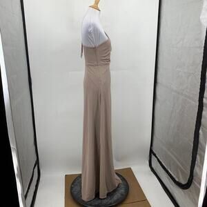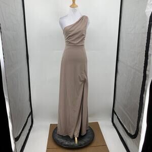 Birdy Grey Dress Womens XS Extra Small Taupe One Shoulder Slit Front Lined Maxi