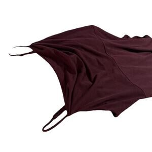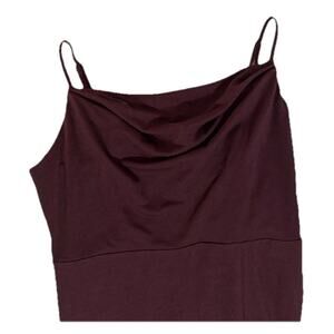 A formal / eveningwear dress by Birdy Grey in a burgundy/maroon/cabernet hue. Square and cowl neck. Adjustable spaghetti straps. Front slit.
