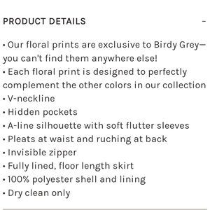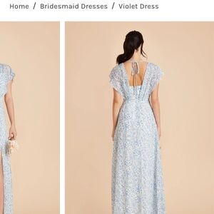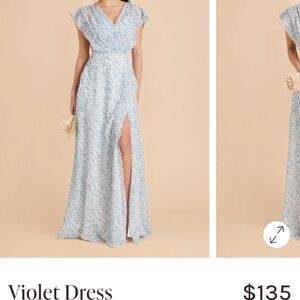 Beautiful, feminine, light blue floral dress by Birdy Grey. Features a flattering silhouette and elegant slit. Perfect for weddings. New with tags. Never worn. size xs.