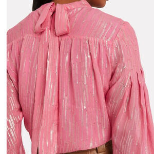 High neck with ties in back Blouson sleeves with button cuffs Defined yoke