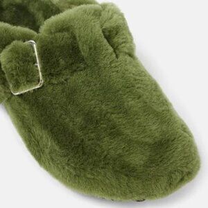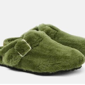 Brand new in box, Birkenstock 1774 Green Boston Shearling Clog, size 41 (10). Upper: shearling. Lining: shearling. Sole: fabric insole, rubber sole. Toe shape: round toe. Made in Germany. Includes: shoe box, dust bag