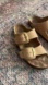 Classic Birkenstock sandals with double brushed gold buckle. Smooth tan colored nubuck leather. Contoured footbed for support. Light wear.