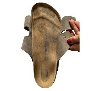 These Birkenstock Sandals have suede upper straps with buckles showing minimal wear with a few spots & scuffs, no discoloration or fading. The straps are not loose, stretched or cracked. The Buckles do not have any rust or wear. Soles show no sign of wear.