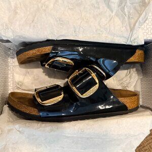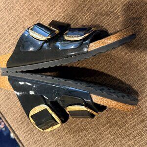 Birkenstock Arizona Big Buckle Sandals - Patent Black with Gold buckle. Womens size 10, mens size 8. Shoes will ship in their original box if you'd like it.