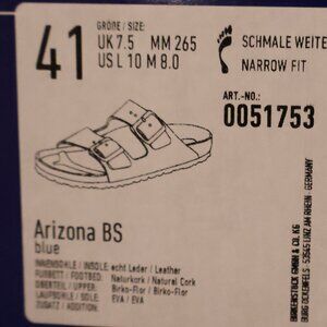 Great pair of Birkenstock Arizona Birko Flor sandals in navy blue, size 41 (US Men’s 8 / Women’s 10) with the narrow fit footbed. Classic double-strap style with adjustable buckles and a supportive cork footbed. Gently worn with normal wear on the footbed but lots of life left. Comes with the original box.