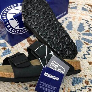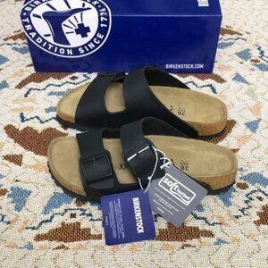 Step into comfort with these Birkenstock black sandals, featuring a classic two-strap design and adjustable buckle closures. The signature contoured footbed provides excellent arch support, making them perfect for all-day wear. Crafted with a leather-like material, these sandals offer both durability and style.