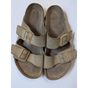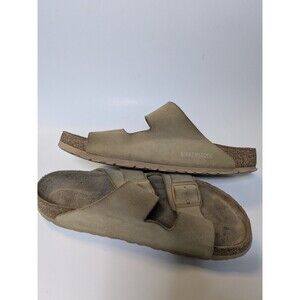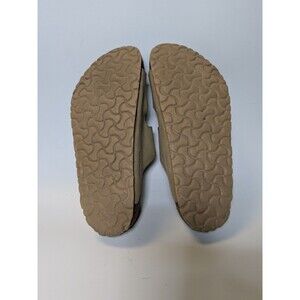 The Birkenstock Arizona Cream Latte sandals in size 41 (Mens 8, Womens 10.5) are comfortable slide sandals designed for women. With a slip-on closure and suede outsole material, these sandals feature nubuck leather upper material in a stylish latte cream color. The iconic buckle accent adds a touch of flair, making them perfect for summer, fall, and spring seasons. Birkenstock's renowned quality and comfort make these sandals a versatile and stylish choice for any casual outfit.