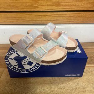 The BIRKENSTOCK Arizona is a genuine classic that has been delighting both men and women for decades. This simple sandal with two straps stands for timeless design and has long held cult status thanks to its comfort factor. This version features an iridescent, silky sheen with multi-colored shimmer and is made of vegan materials.